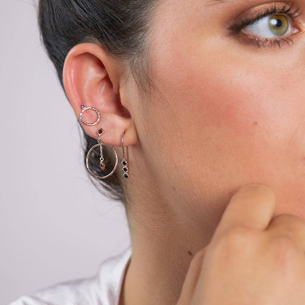 Rose gold-plated garnet hoop earrings with pendants are an elegant and sophisticated piece that should be part of your collection. Crafted from sterling silver and coated with rose gold, they offer exceptional shine and durability. The original design features a ring-shaped pendant with a garnet at the center, a gemstone that symbolizes passion and love. They are perfect for any occasion, suit any style, and can add the finishing touch you need to complete your look. They come in an elegant gift box and are a great choice for a special gift. In short, they are a unique and beautiful piece that will enhance any outfit.