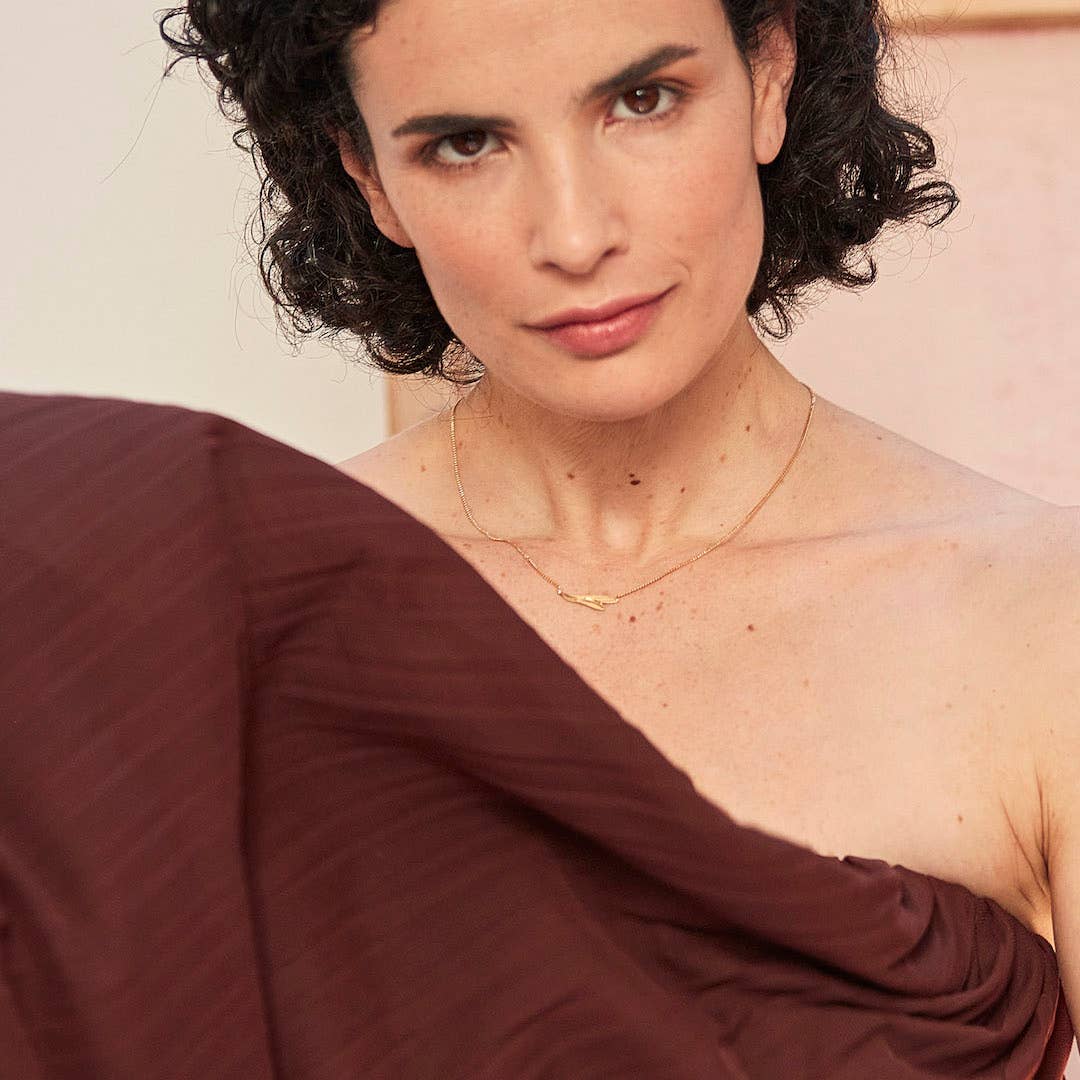 From the GARDEN COLLECTION by Nadja Carlotti - • Small plant whose pattern is inspired by the calyx of Euphorbia, a generous and resistant plant from the Charentais coast with beautiful elongated leaves. Made of brass, plated with fine gold. An original model for its asymmetry and its lightness and its finely engraved pattern, easy to wear. • Sample size: W: 0.5 cm x H: 2.2 cm Total length: 38 cm + adjustment chain • Made in France