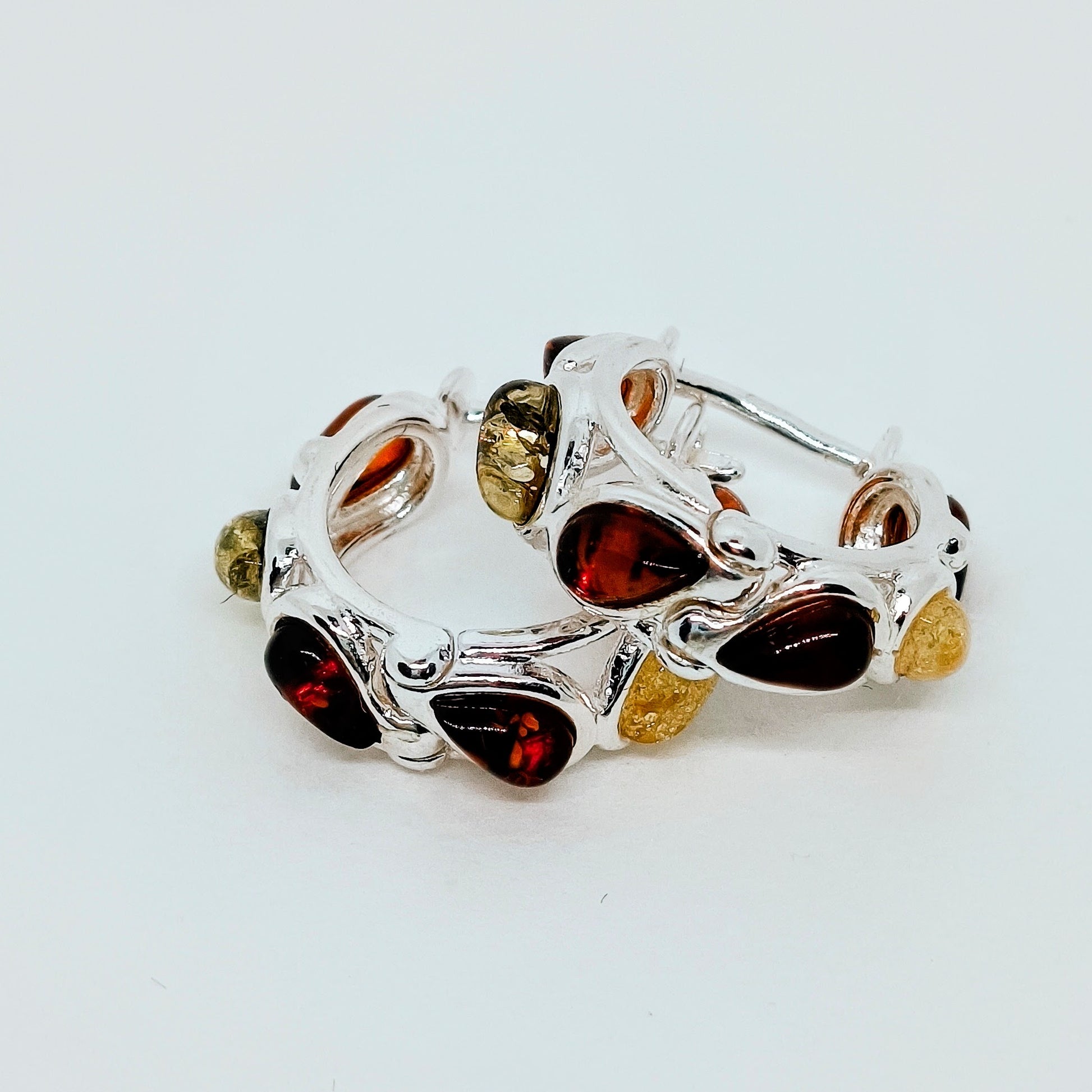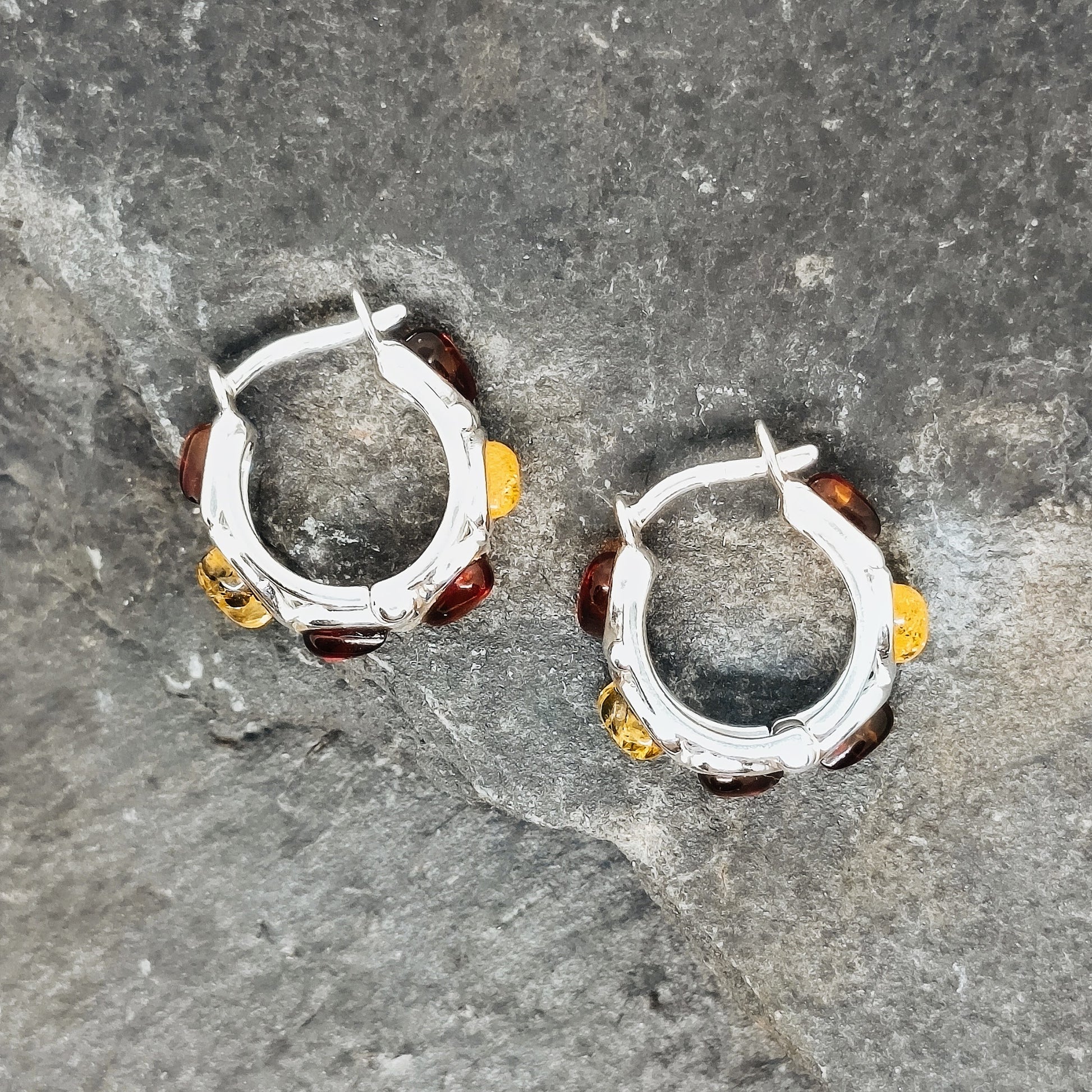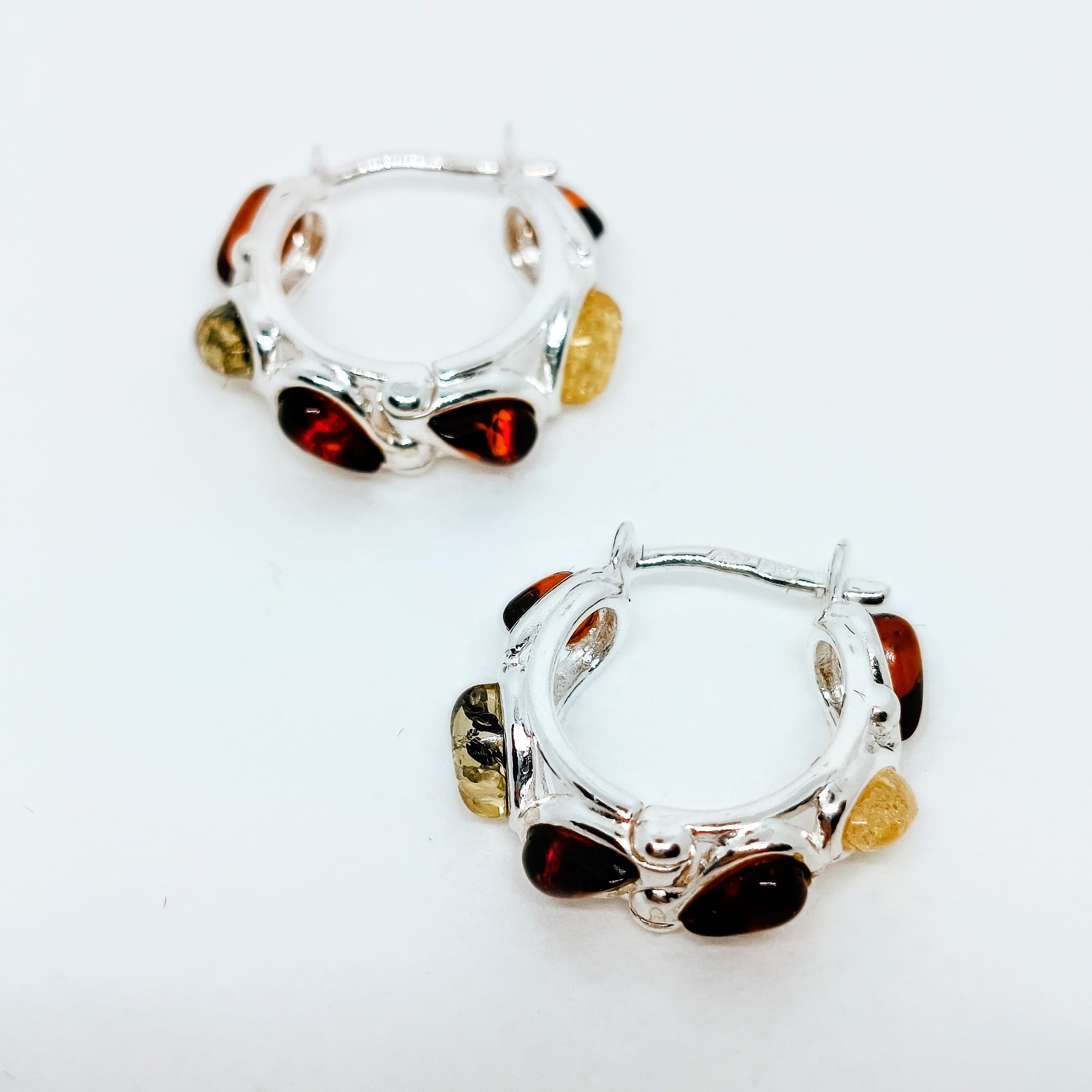 Baltic amber and 925 sterling silver, hallmarked. These small, sweet multicolored hoops are 1.8 cm long (circle diameter). All parts are made of 925 sterling silver. They have a clasp closure.