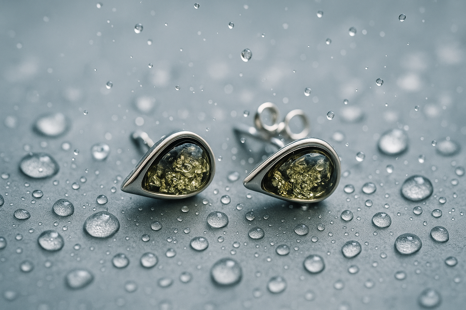 Green amber stud earrings, 925 silver, teardrop shape