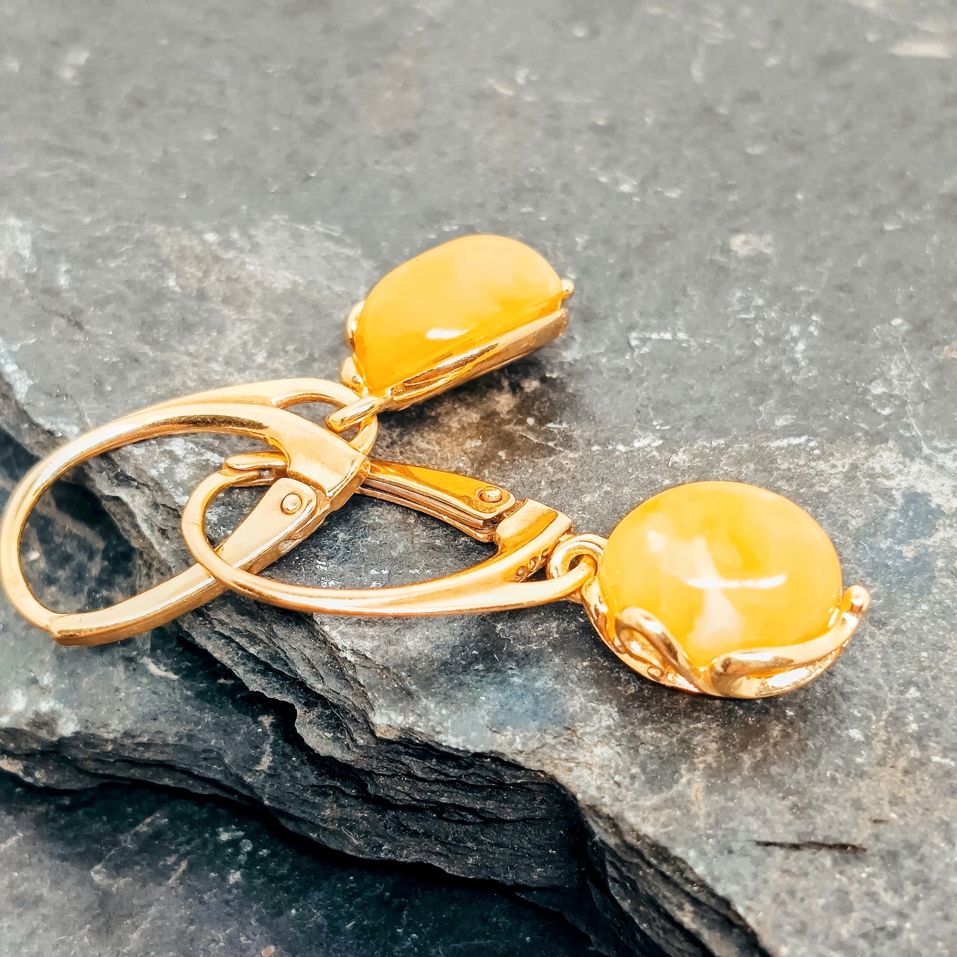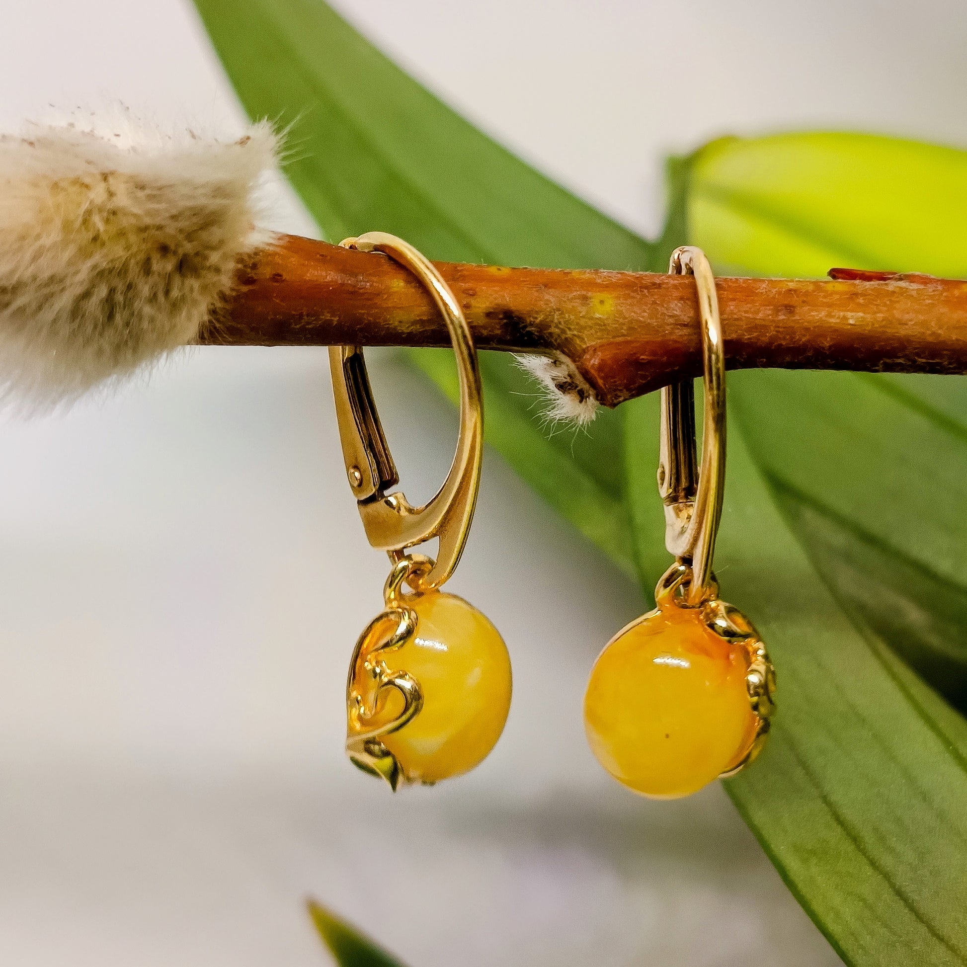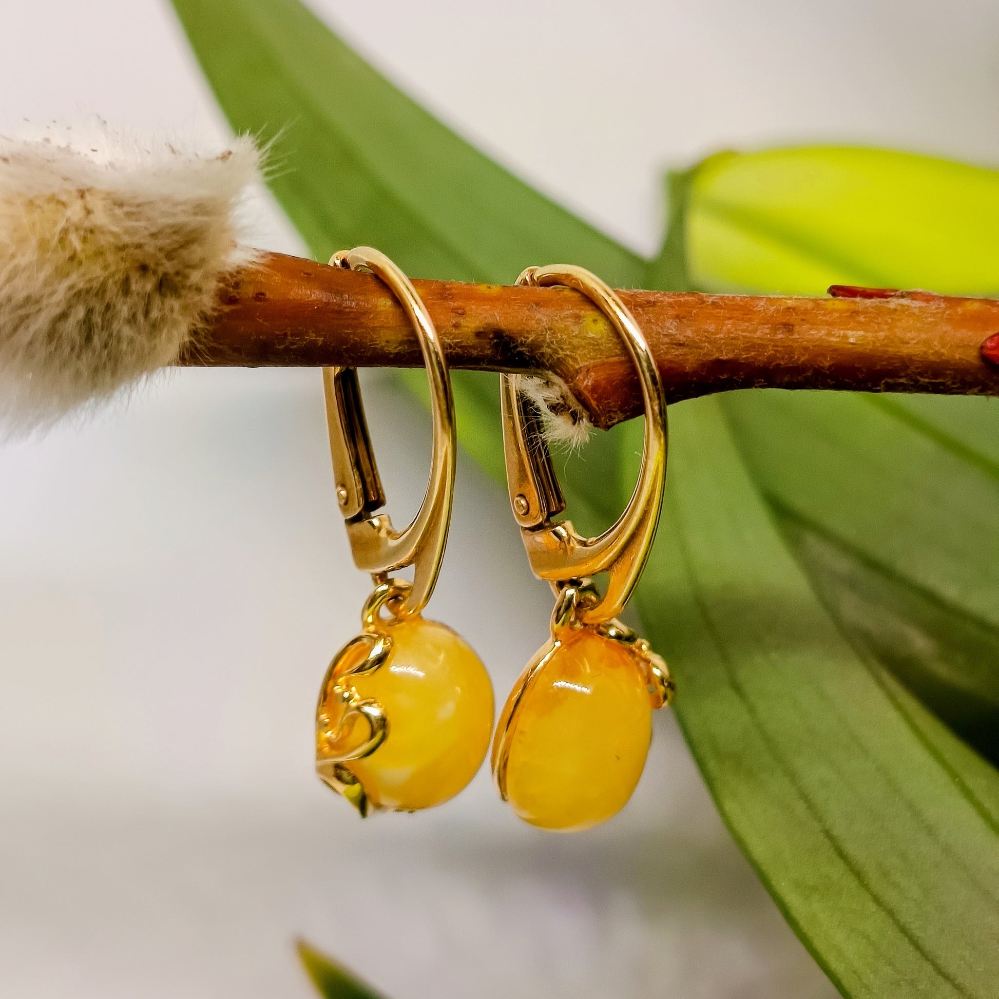 Kleine hängende Bernsteinohrringe, hergestellt aus vergoldetem 925er-Sterlingsilber und baltischem Bernstein. Mit silbernen Stempel. Sehr süß und elegant. Länge 2,9 cm mit hinterer Hebelverriegelung. Dieser Artikel wurde aus natürlichem baltischem Bernstein gefertigt. Der gesamte Bernstein, der für diesen Schmuck verwendet wird, wird in Litauen gesammelt. Wir verkaufen nur echten, nicht gepressten, authentischen, natürlichen baltischen Bernstein.