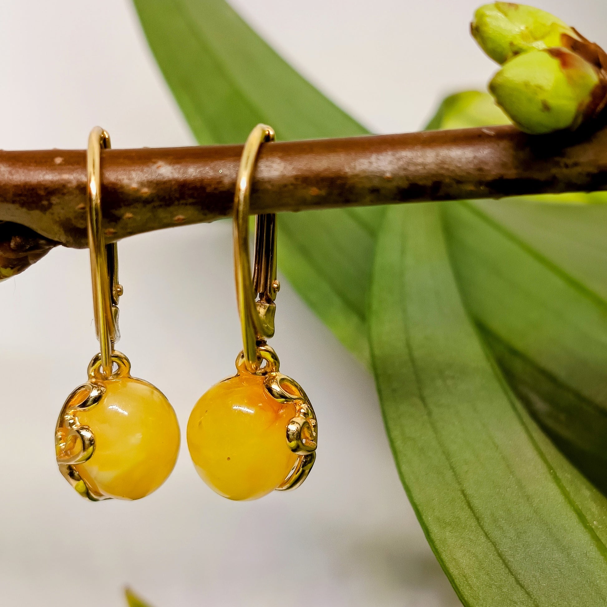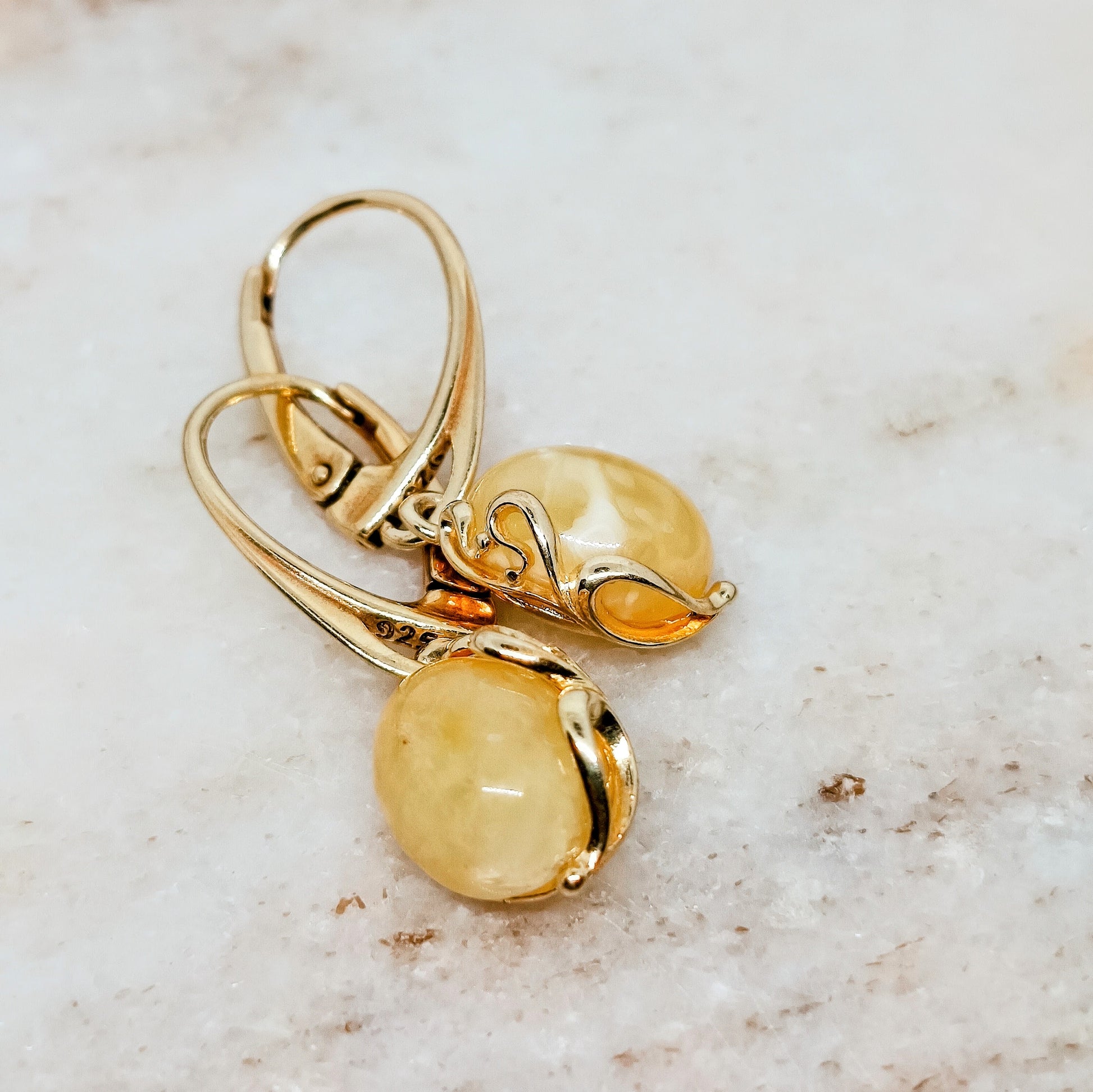Weiße Ohrringe aus baltischem Bernstein, 925 Silber vergoldet
