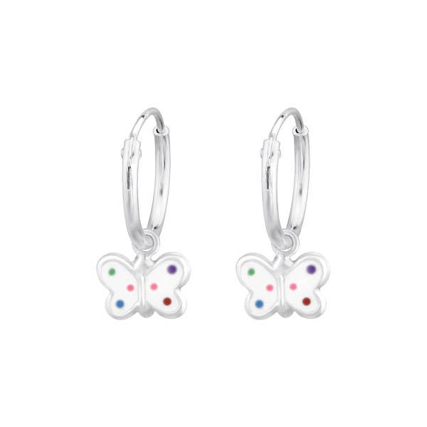 Creole aus 925er Silber und anlaufgeschützt mit einem Einhänger als Schmetterling. Der Schmetterling wurde von Hand kaltemailliert in weiß mit bunten Punkten. Ein fröhlich wirkendes Schmuckstück.
